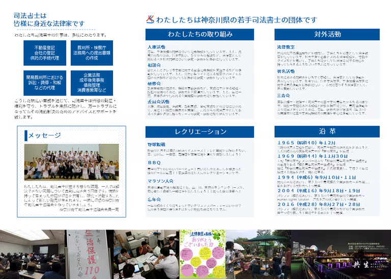 | 目的 | 神奈川県内において、法曹人たる自覚にたつ青年司法書士が切差琢磨することによって 司法書士制度の改善及び進歩発展をすると共に、 社会に生起する法的諸問題の解決に向けた活動を通じて市民社会の繁栄に寄与する。 |
